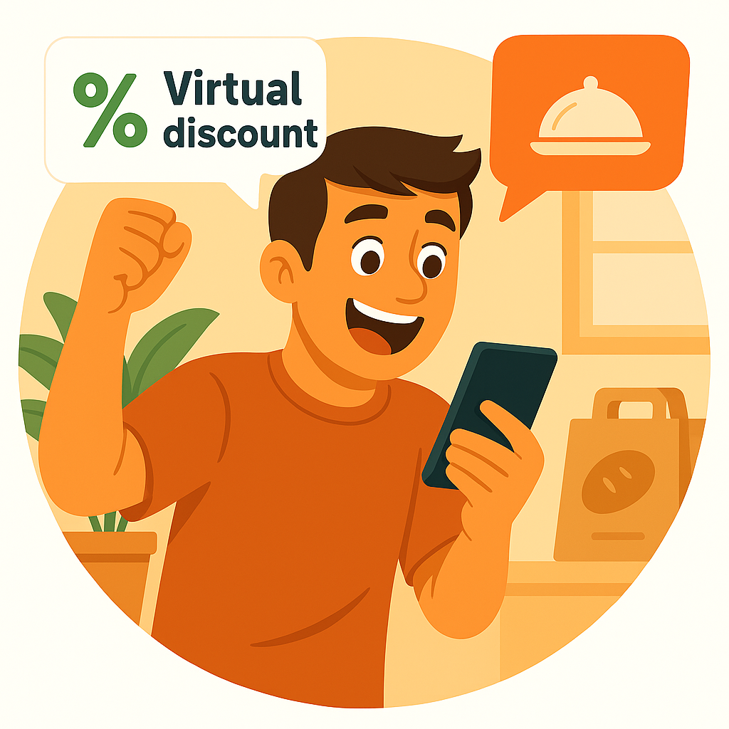 Illustration of a Happy Customer Engaging with Mobile Discounts