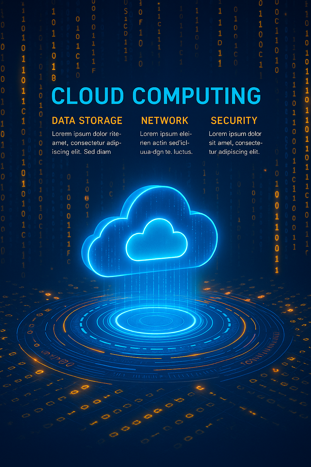 /Collection: /by davooda/Type: PNG/A modern digital graphic illustrating cloud computing concepts with glowing elements and binary code, suitable for tech presentations or marketing materials.