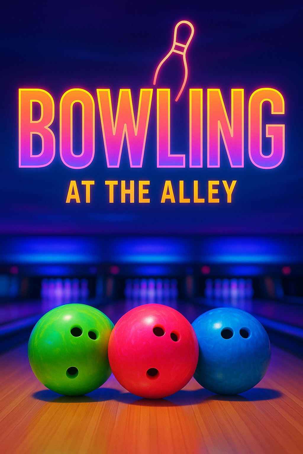 Colorful promotional graphic for a bowling alley featuring three bowling balls in vibrant colors, set against a neon-lit background, ideal for advertising events or specials.