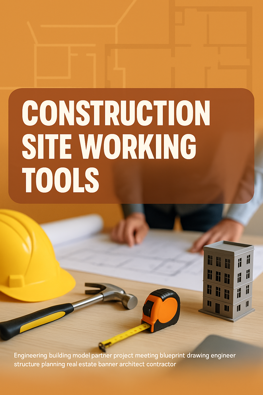 A professional image showcasing essential construction tools laid out on blueprints, ideal for project management and real estate marketing.