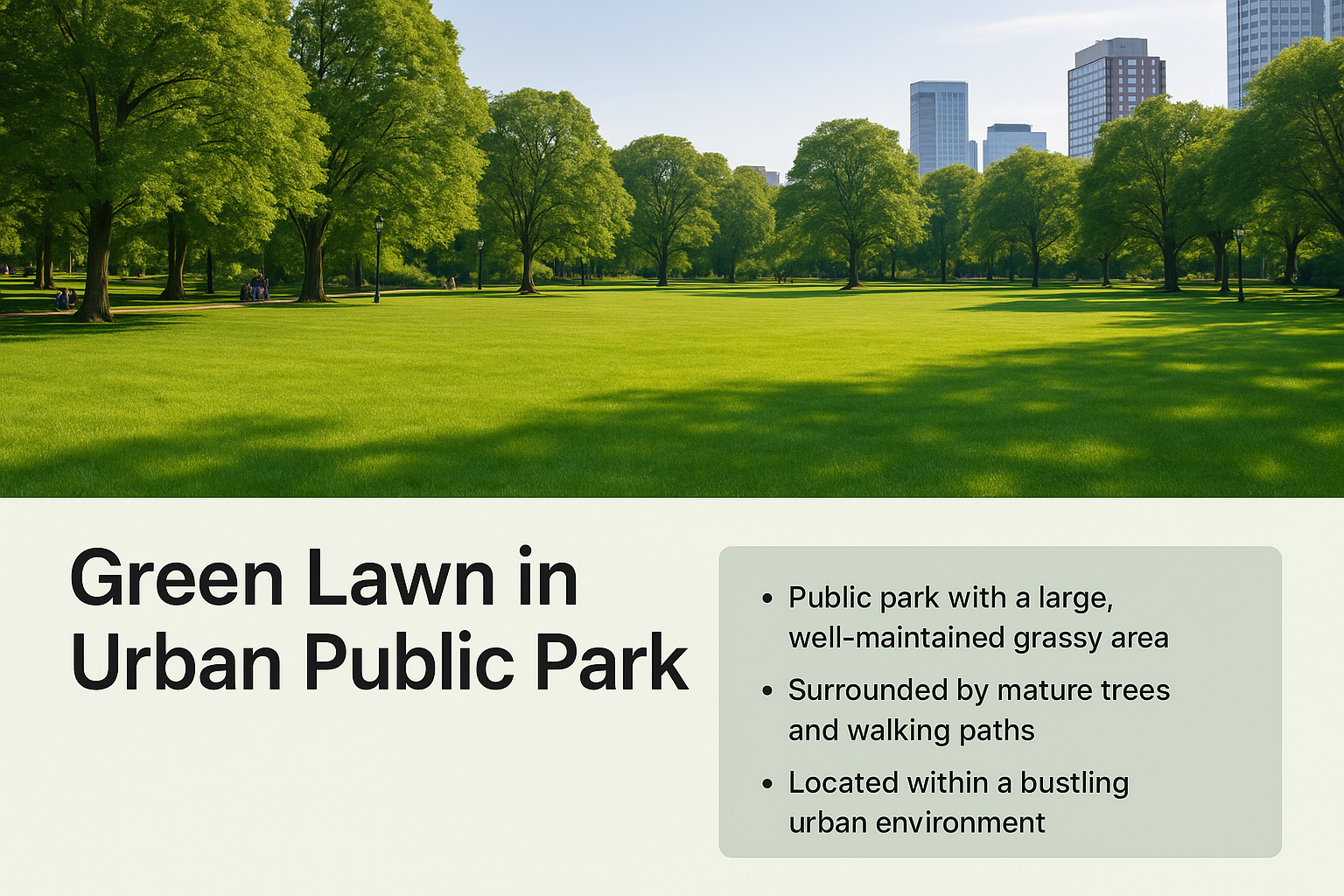 A tranquil urban park scene showcasing a large, well-maintained grassy area surrounded by mature trees and modern buildings, ideal for promoting outdoor activities and city life.