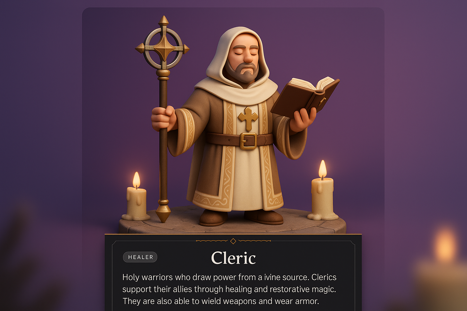 A detailed 3D illustration of a cleric holding a book and staff, surrounded by candles. The dark-themed panel integrates seamlessly, showcasing the character's healing powers.