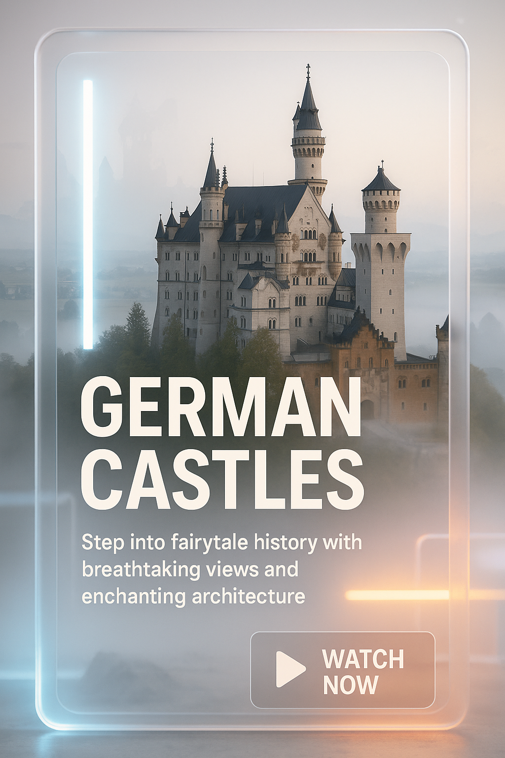 /Collection: /by davooda/Type: PNG/An eye-catching promotional graphic featuring a stunning castle image, designed to attract viewers to explore German castles with a modern and sleek aesthetic.