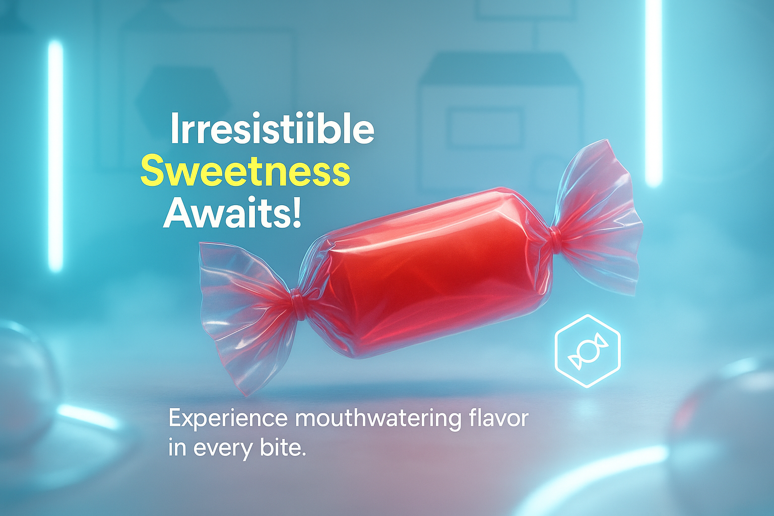 A visually striking promotional graphic featuring a 3D candy design with a glowing background, ideal for marketing sweet products online.