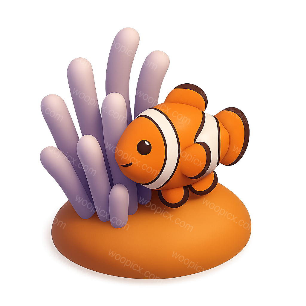 A vibrant 3D illustration of a clownfish nestled in a colorful anemone. The design features a playful aesthetic with a transparent background, showcasing a three-quarter view.