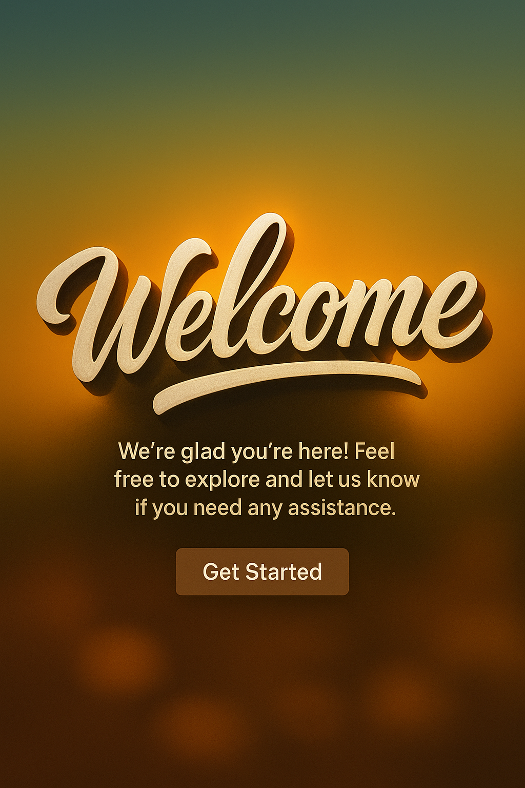 A visually appealing welcome graphic designed for digital interfaces. It features a warm gradient background, stylish typography, and a call-to-action button, ideal for onboarding users.