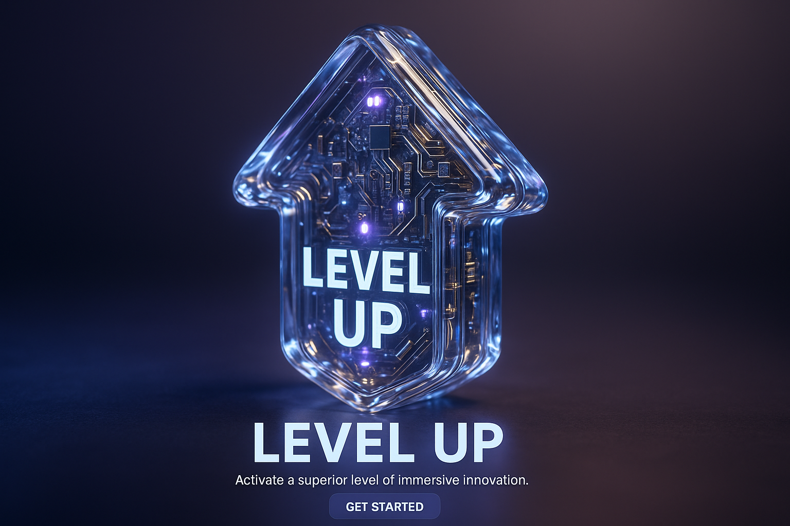 /Collection: /by davooda/Type: PNG/A stunning 3D level up icon crafted from clear materials, showcasing glowing micro-LEDs and intricate circuits. The scene features a soft gradient background and neon accents, emphasizing its high-tech aesthetic.