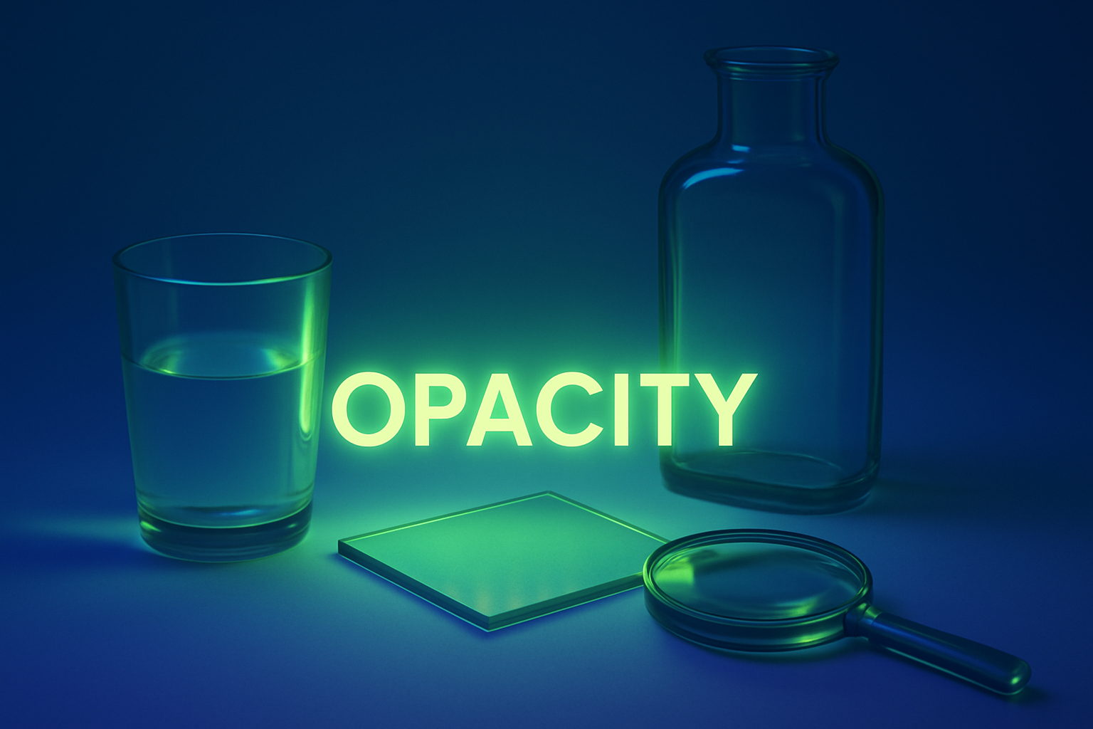 The image features the word 'Opacity' glowing softly in light yellow-green, surrounded by glass objects. A glass of water, a glass bottle, and a magnifying glass enhance the theme of transparency and light.