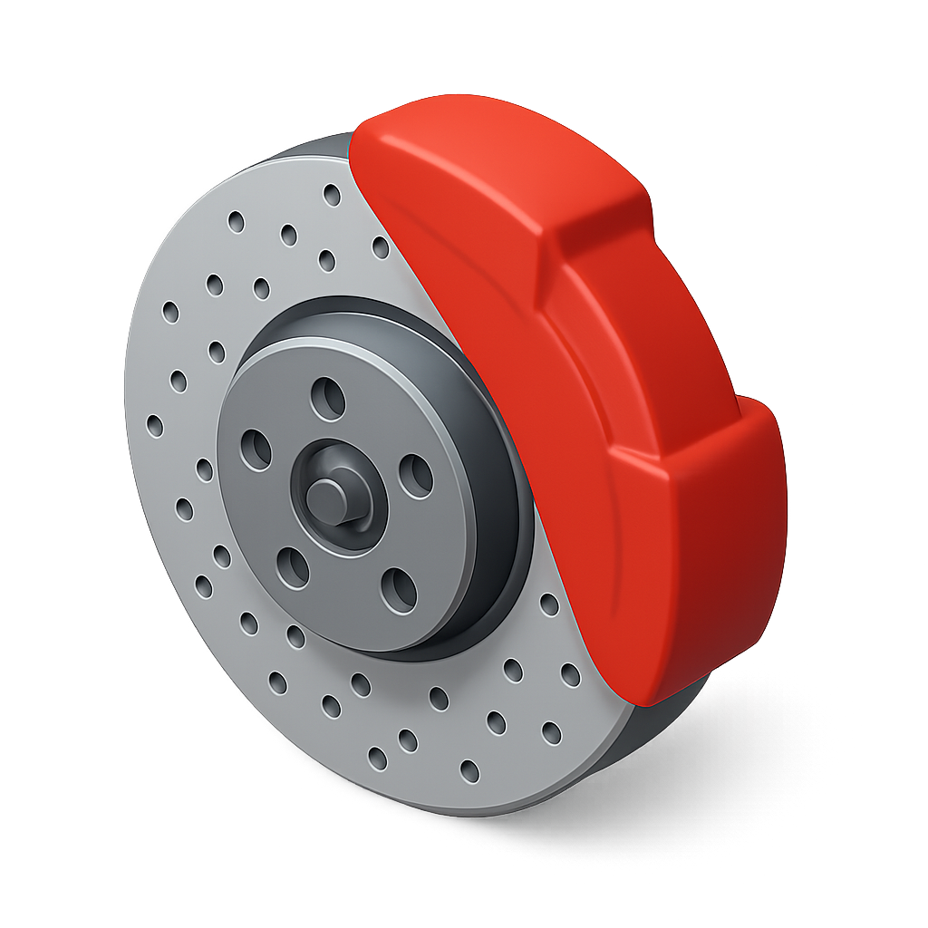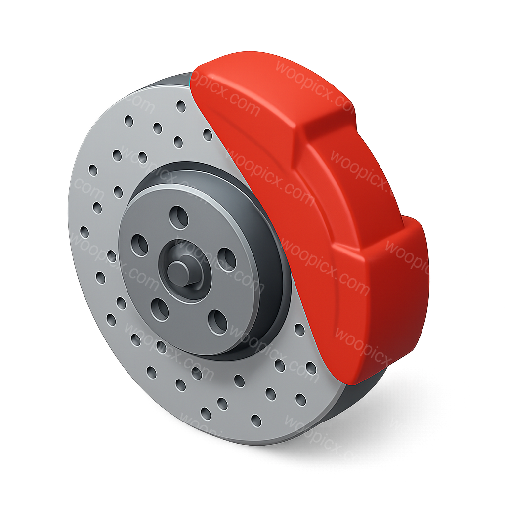 A sleek 3D representation of a brake disc and caliper, featuring a vibrant red caliper against a metallic gray disc. The design offers an isometric, volumetric feel on a transparent background.
