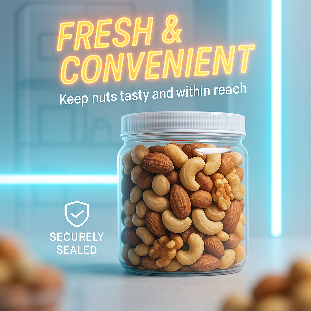 A visually appealing image showcasing a clear jar filled with various nuts, emphasizing freshness and convenience. Ideal for health-focused marketing.