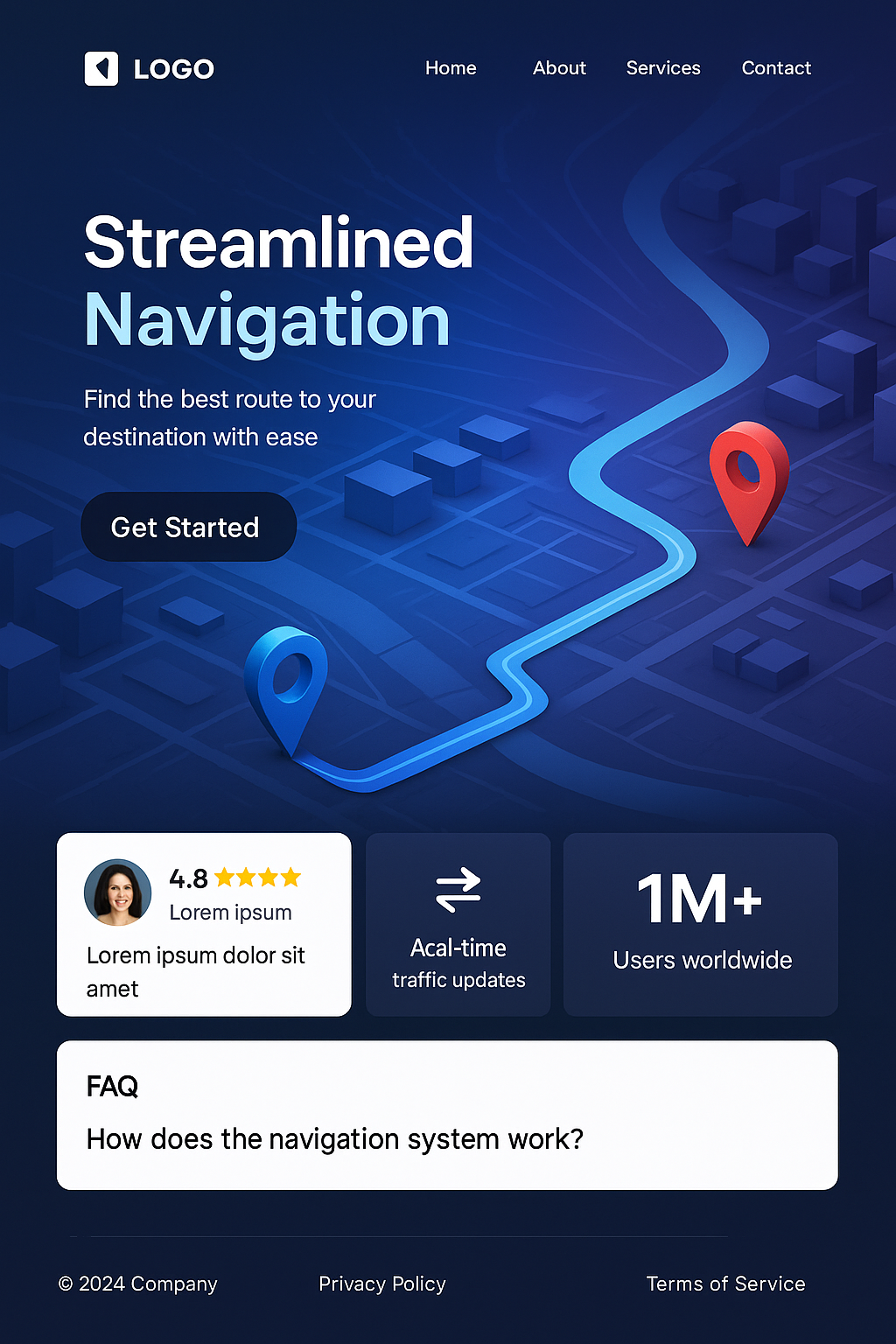 /Collection: /by davooda/Type: PNG/A visually engaging landing page featuring a minimalist 3D city map, GPS navigation route, and vibrant blue tones. The design includes a prominent action button, user testimonials, and key statistics.