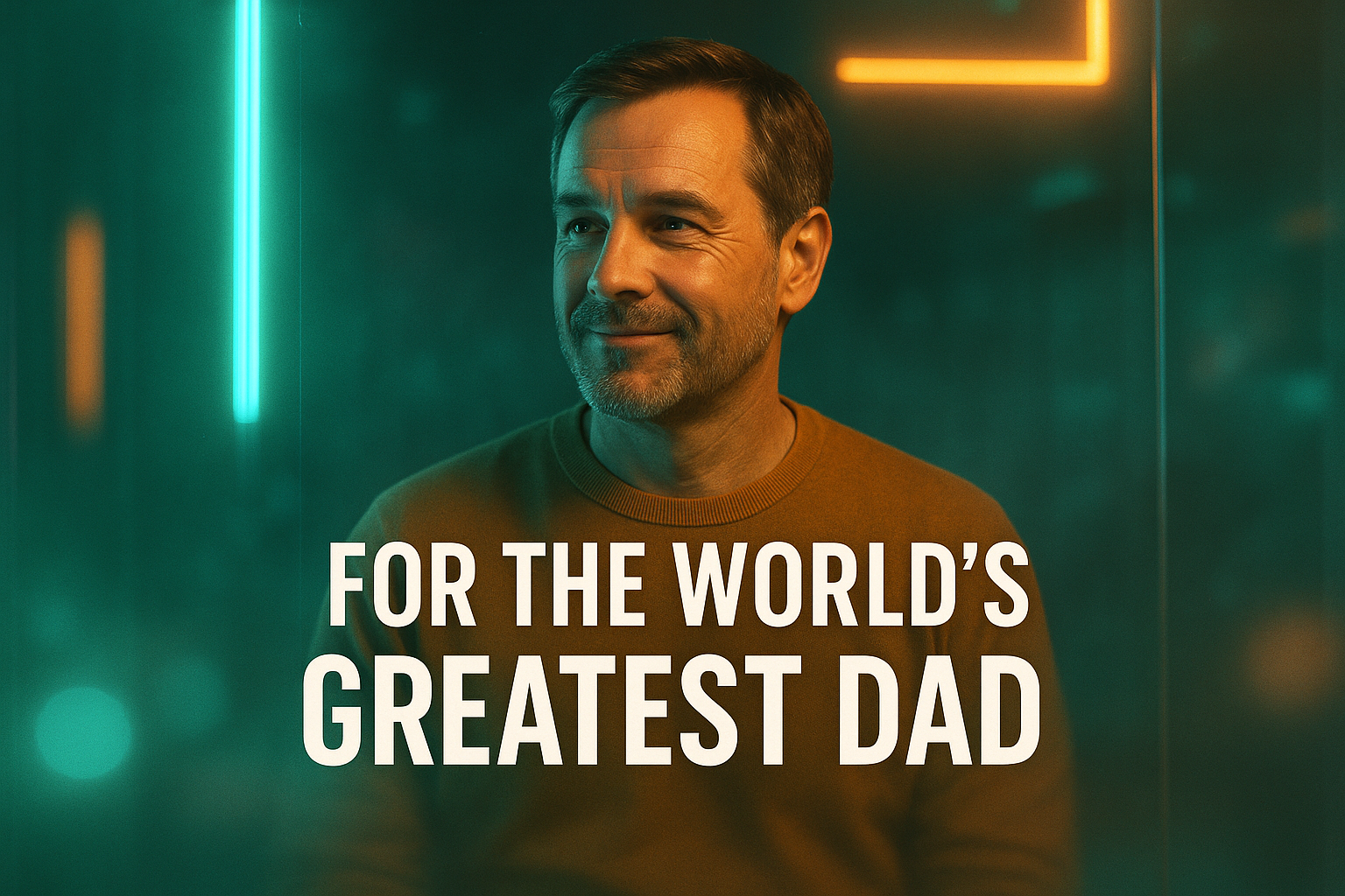 A captivating image featuring a smiling dad against a neon-lit backdrop. The scene combines deep greens, warm golds, and glowing accents, creating a warm atmosphere. Perfect for Father's Day celebrations.