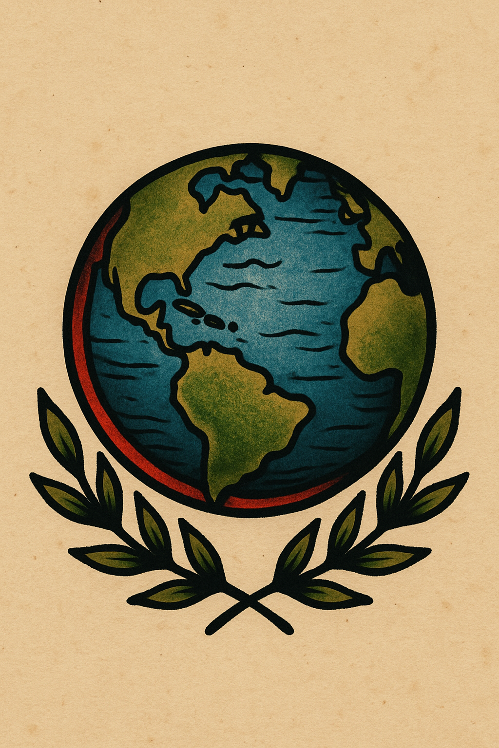 /Collection: /by davooda/Type: PNG/This image features a stylized globe with olive branches, representing peace and global unity. Its vintage design is suitable for educational or environmental themes.