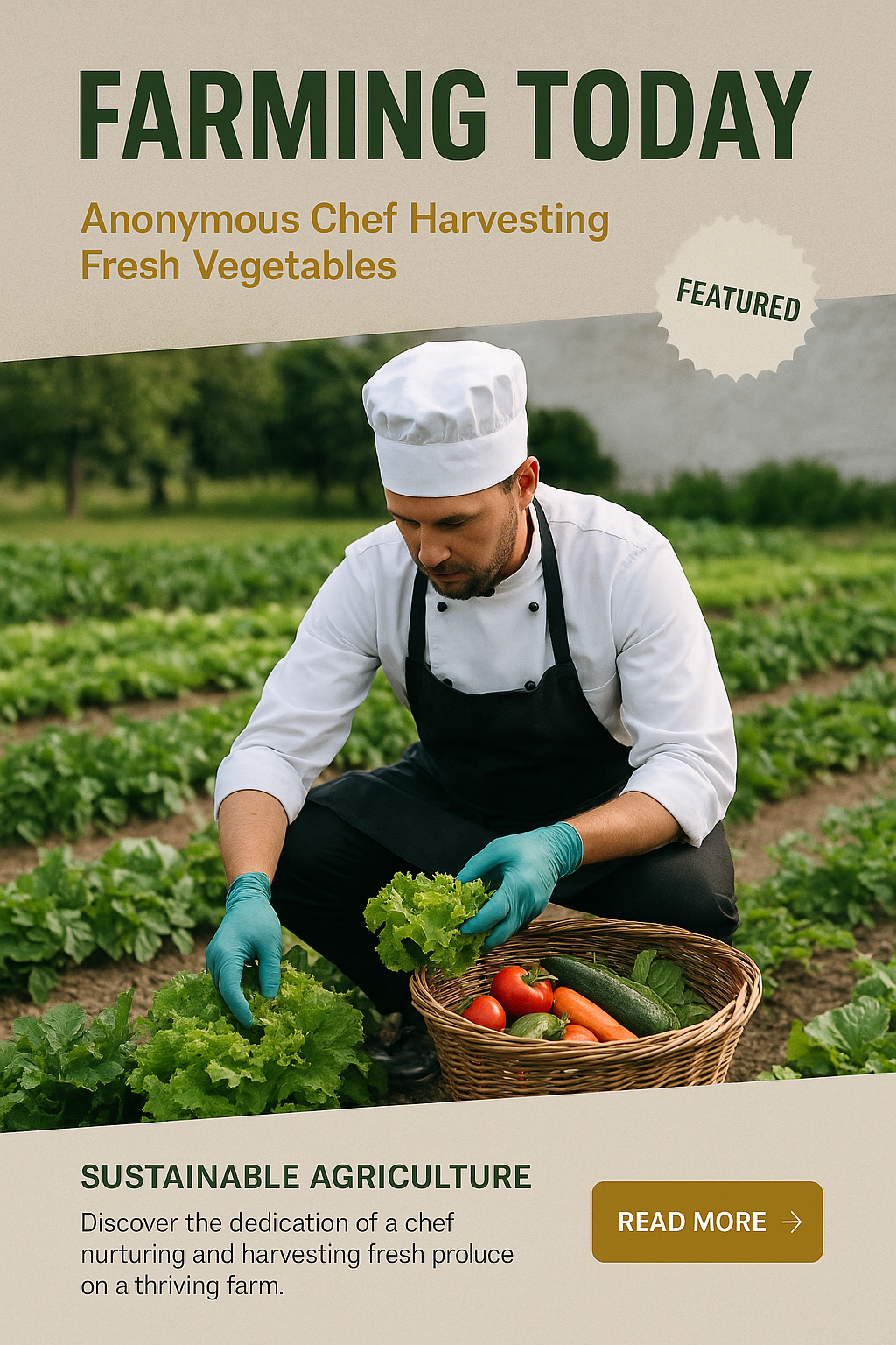 /Collection: /by davooda/Type: PNG/An anonymous chef is seen harvesting fresh vegetables in a vibrant farm setting, showcasing sustainable agriculture practices. The chef, dressed in a white uniform and hat, gathers produce in a basket.