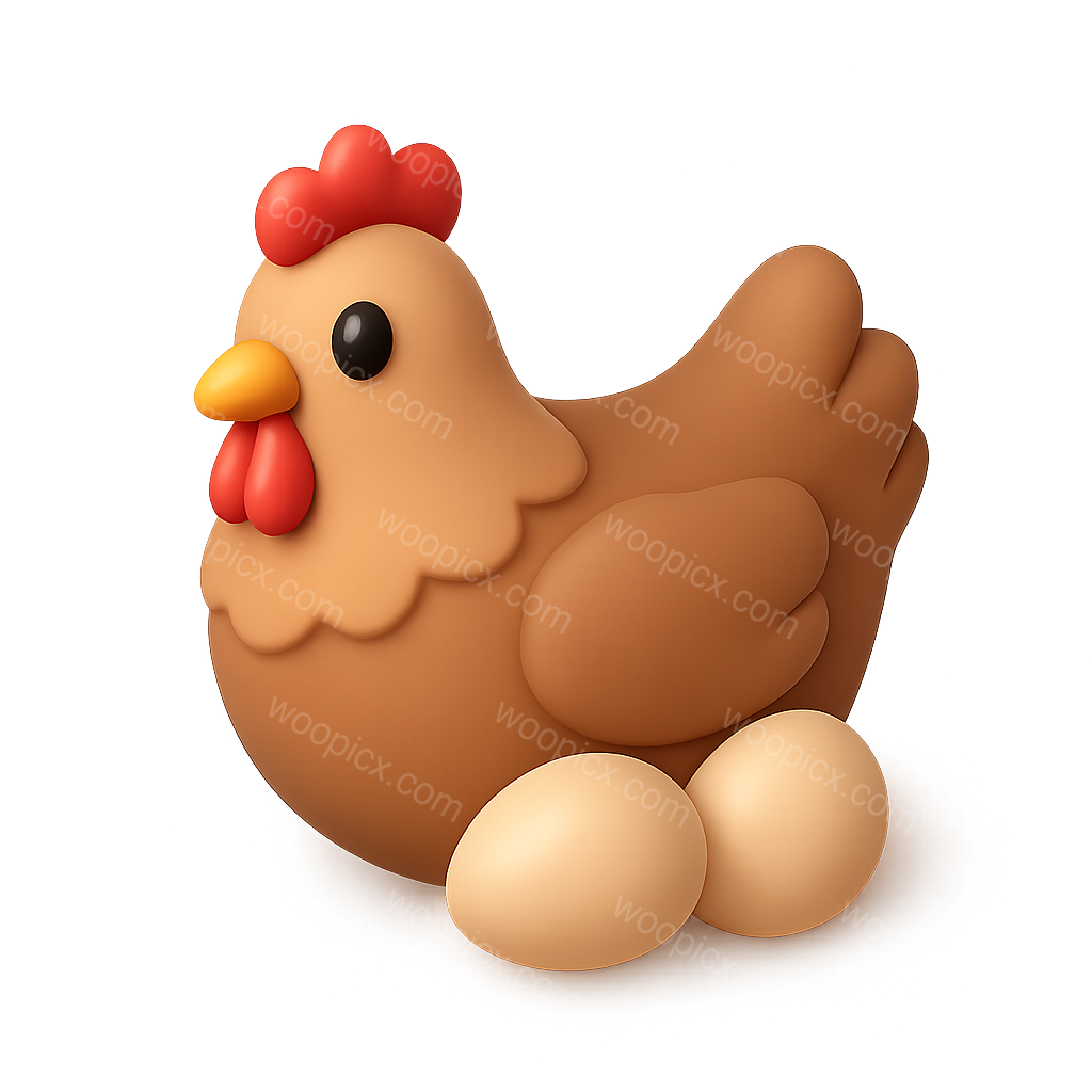 A stylized 3D icon of a hen in three-quarter view, featuring a smooth, cartoonish design. The hen is brown with a red comb and beak, accompanied by two eggs, set against a softly blurred background.