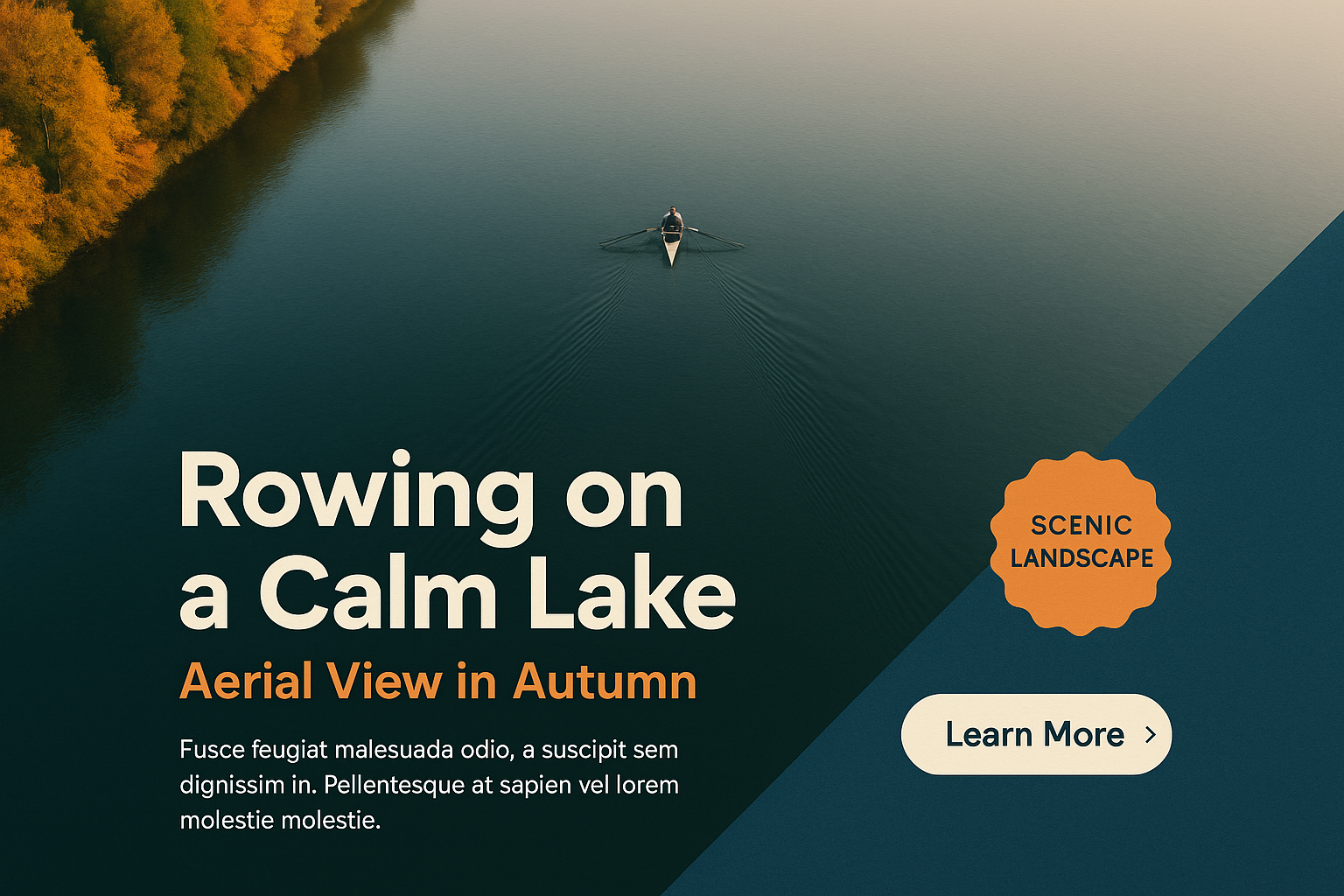 An aerial view captures a lone person rowing on a tranquil lake surrounded by autumn foliage. The serene water offers ample empty space for text, enhancing the peaceful vibe.