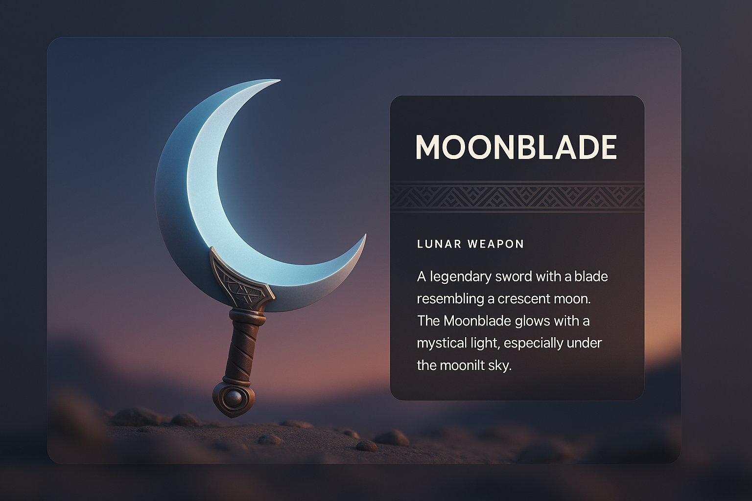 /Collection: /by davooda/Type: PNG/A detailed 3D illustration of the Moonblade, featuring a crescent-shaped weapon with an elegant design. The composition includes informative text and a dark background, enhancing visual appeal.