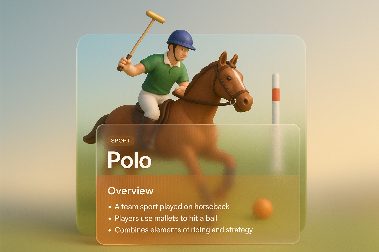 /Collection: /by davooda/Type: PNG/A vibrant 3D illustration showcasing a polo player on horseback, integrated with a stylish design block featuring text and graphics. The background transitions smoothly, enhancing the visual appeal.