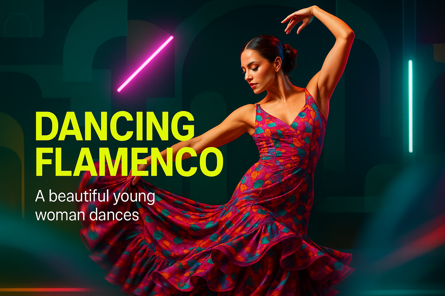 Dynamic poster showcasing a young woman performing flamenco, with bright colors and modern design elements. Ideal for dance events or cultural promotions.