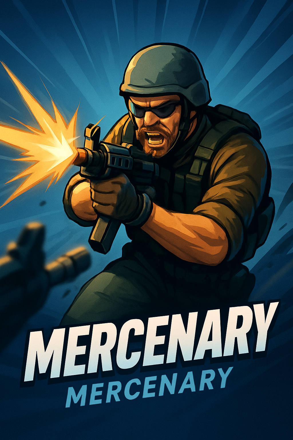 A vibrant illustration of a mercenary in action, wielding a weapon with intense focus. Dynamic lines radiate from the center, enhancing the sense of movement.
