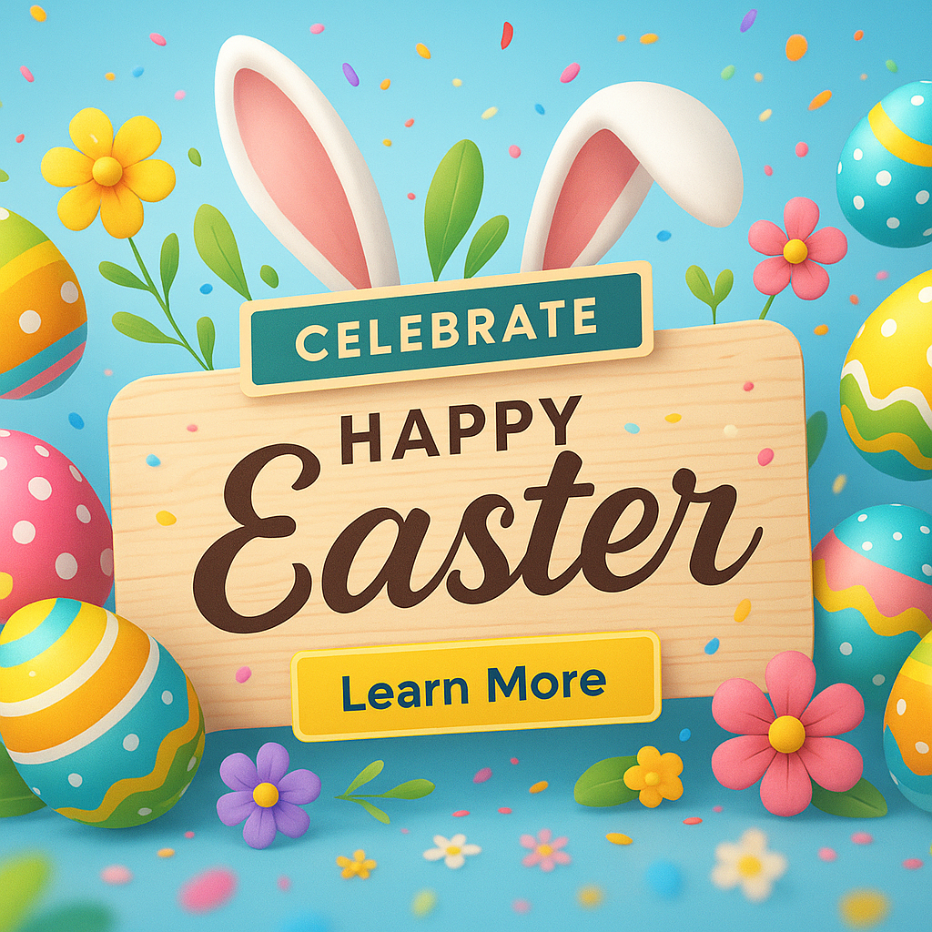 Festive Easter Celebration Graphic with Colorful Eggs and Flowers