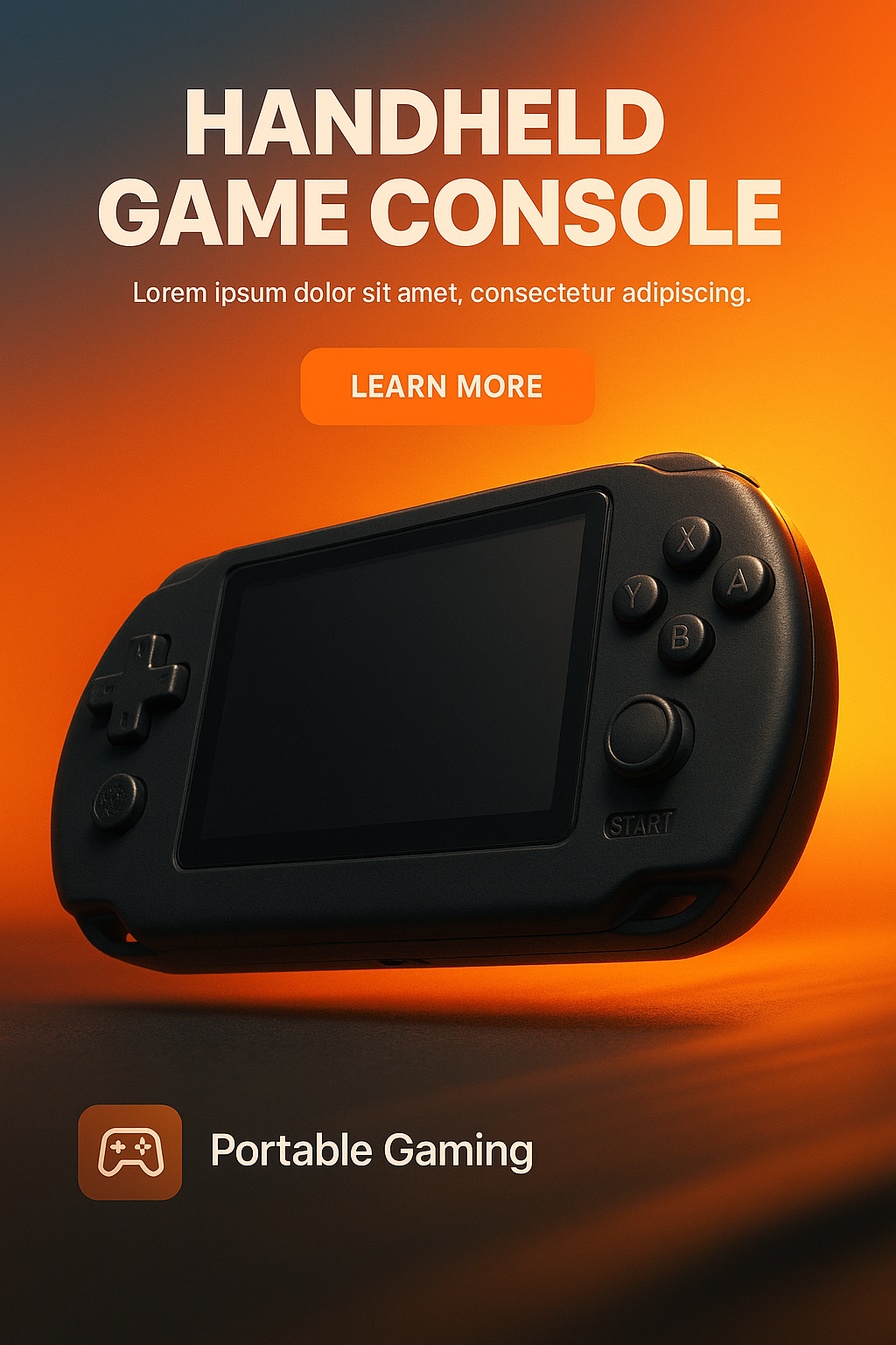 This image features a sleek handheld game console against a gradient orange background. It's designed for promotional use, targeting gaming enthusiasts.
