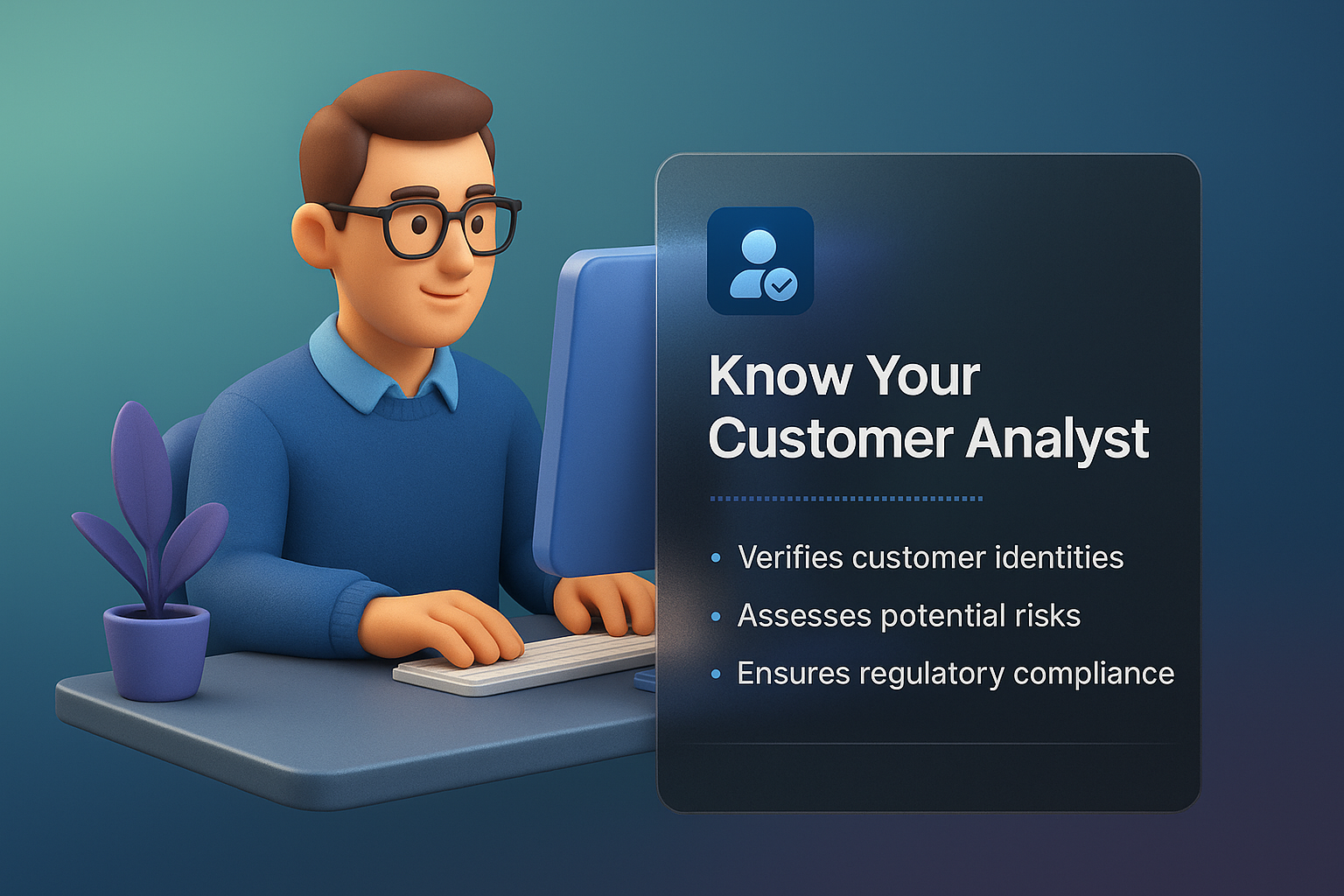 /Collection: /by davooda/Type: PNG/This image features a 3D representation of a Know Your Customer Analyst at a desk, with a dark panel showcasing key responsibilities. The background has a smooth gradient, enhancing the visual appeal.