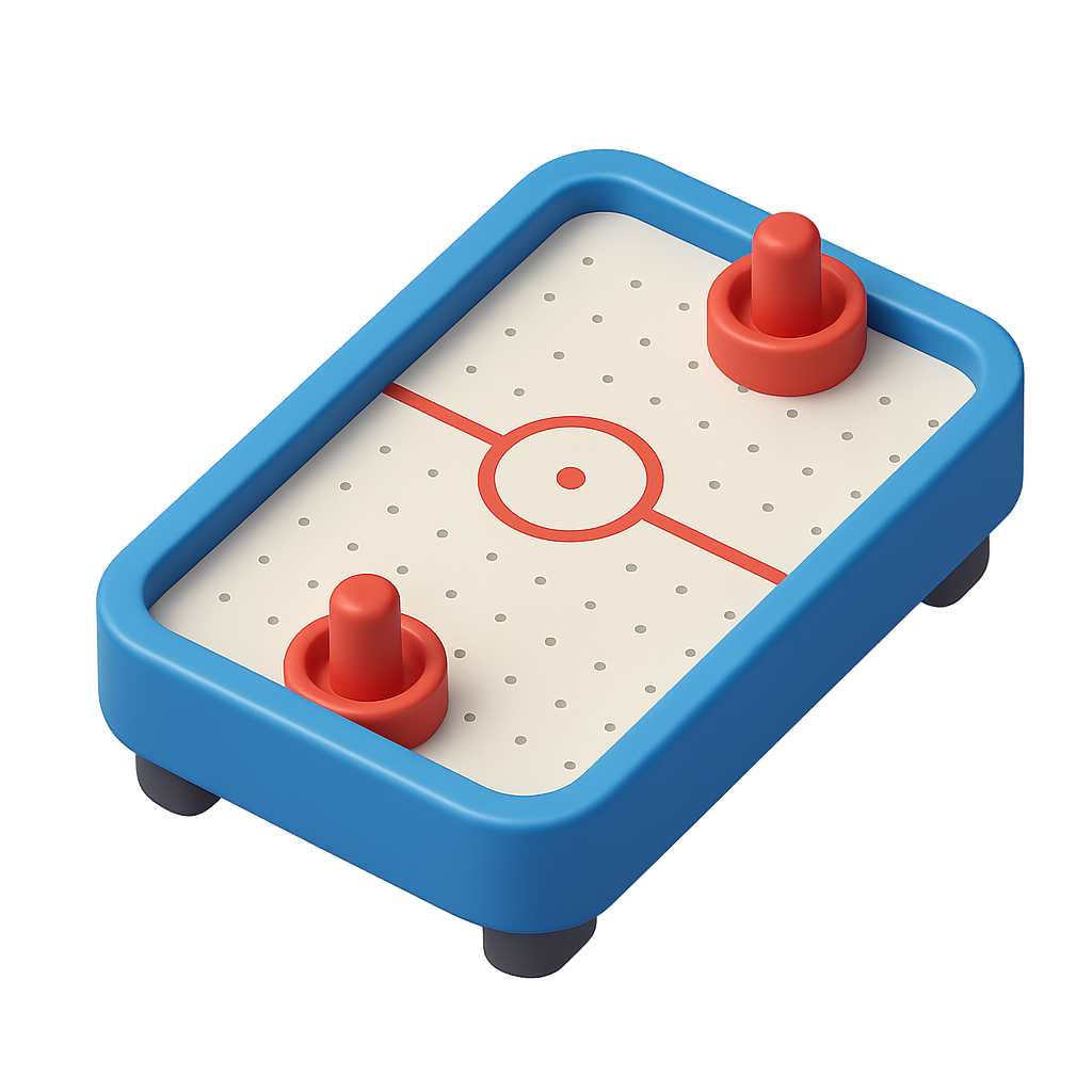 A colorful 3D air-hockey table icon featuring a blue frame, red paddles, and a dotted surface, designed for a modern, isometric aesthetic.