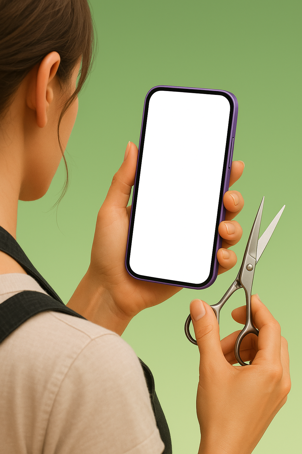 A woman hairdresser is holding a purple phone in one hand and scissors in the other. The phone has a white screen and is viewed from behind her shoulder, creating a dynamic angle.