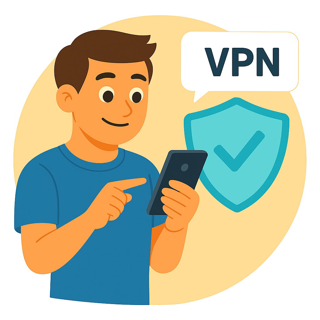 Colorful digital illustration depicting a person engaging with a smartphone while using a VPN, featuring a shield symbol for security. Ideal for tech-related content.