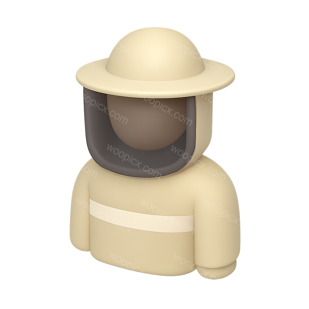 A stylized 3D icon of a beekeeper in a three-quarter view, featuring a beige suit and hat with a gray veil. The design is simple yet conveys a strong 3D feel.