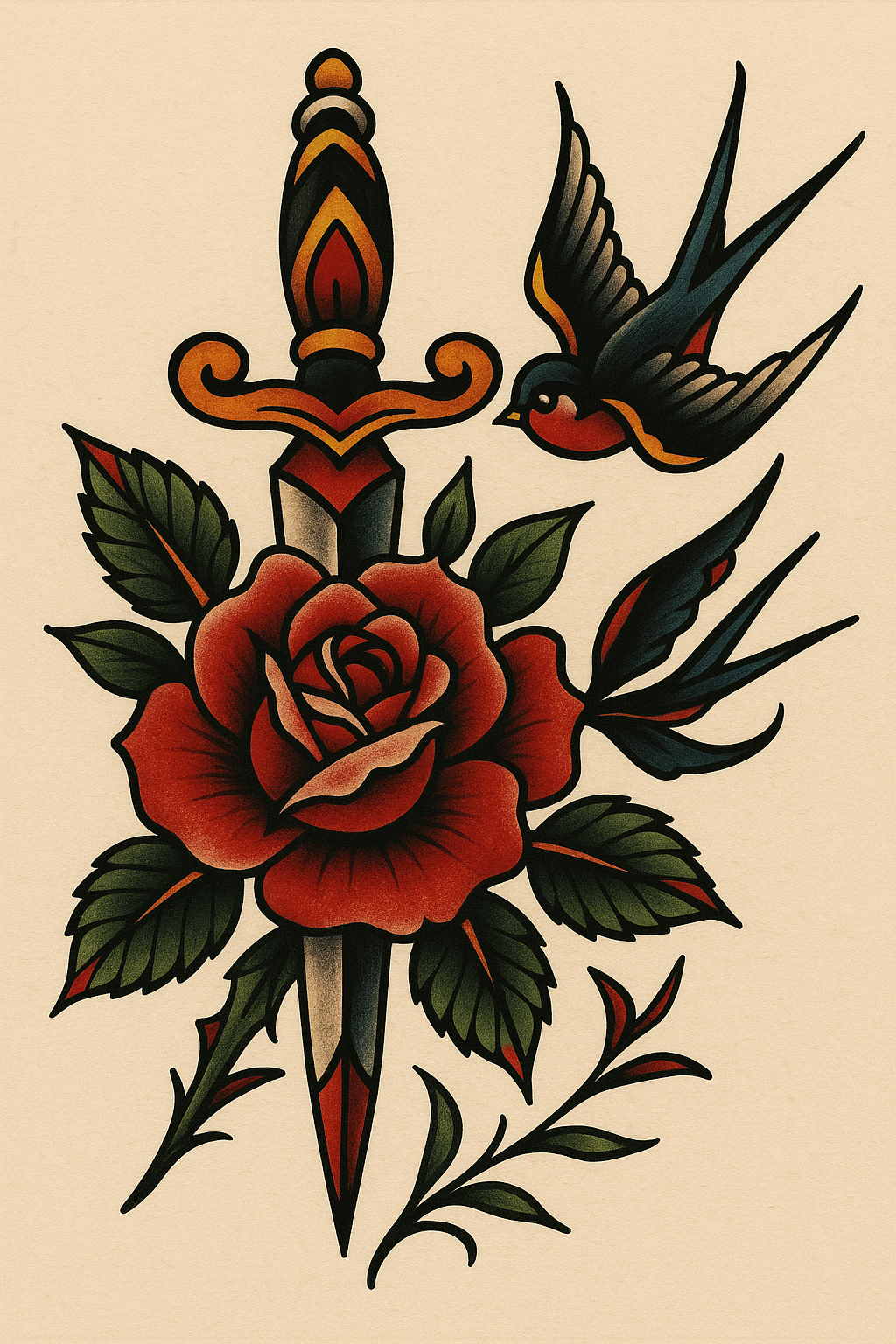 /Collection: /by davooda/Type: PNG/This image showcases a vibrant traditional tattoo design featuring a rose, a swallow, and a dagger, with bold colors and classic tattoo style. It's ideal for tattoo enthusiasts and artists.
