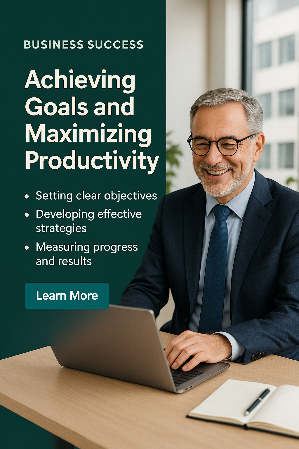 Informative graphic designed for business motivation, featuring a professional man at a desk with a laptop. Ideal for corporate training or coaching.