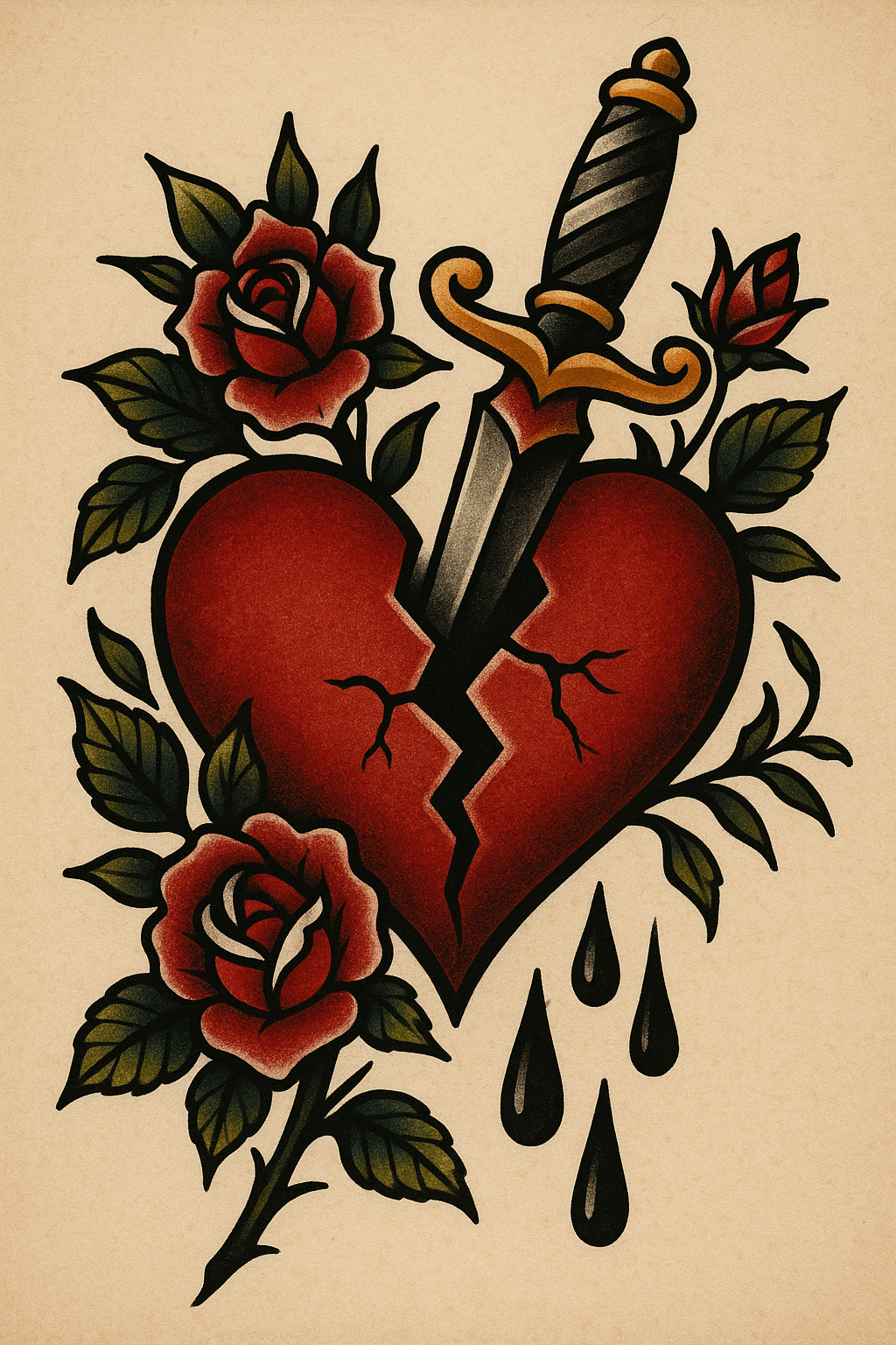 /Collection: /by davooda/Type: PNG/This image features a traditional tattoo-style illustration of a broken heart pierced by a dagger, surrounded by roses. It has a bold and colorful design, suitable for tattoo art.