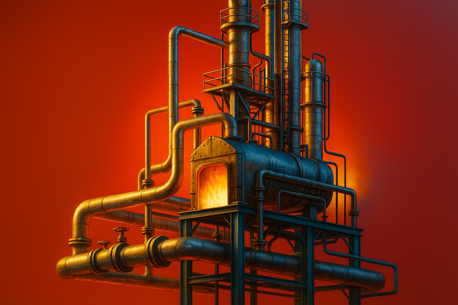 /Collection: /by davooda/Type: PNG/A realistic depiction of industrial pipeline transport featuring metallic pipes, a furnace, and chemical manufacturing equipment against a vibrant solid color background, showcasing intricate design and lighting.