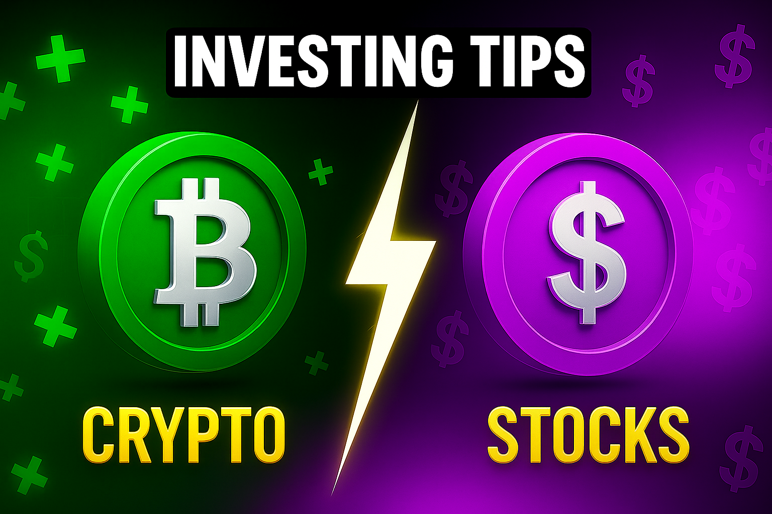 /Collection: , /by davooda/Type: PNG/A vibrant infographic showcasing investment tips focused on cryptocurrencies and stocks, featuring contrasting colors and bold visuals to attract finance enthusiasts.