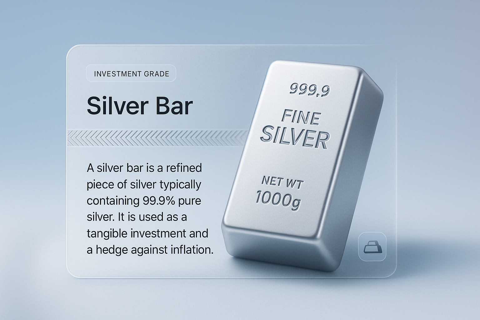 A sleek 3D silver bar on a smooth gradient background, featuring investment details and a modern design layout. The composition emphasizes realism and clarity.