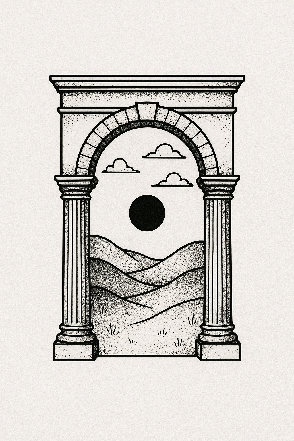 A minimalist black and white illustration featuring a classical archway framing a landscape with rolling hills and a sun. Ideal for art prints and modern decor.