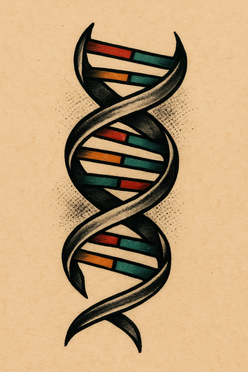 /Collection: /by davooda/Type: PNG/This image features a stylized DNA helix with vibrant colored strands, designed with a vintage aesthetic. Ideal for science, biology, or art-themed projects.