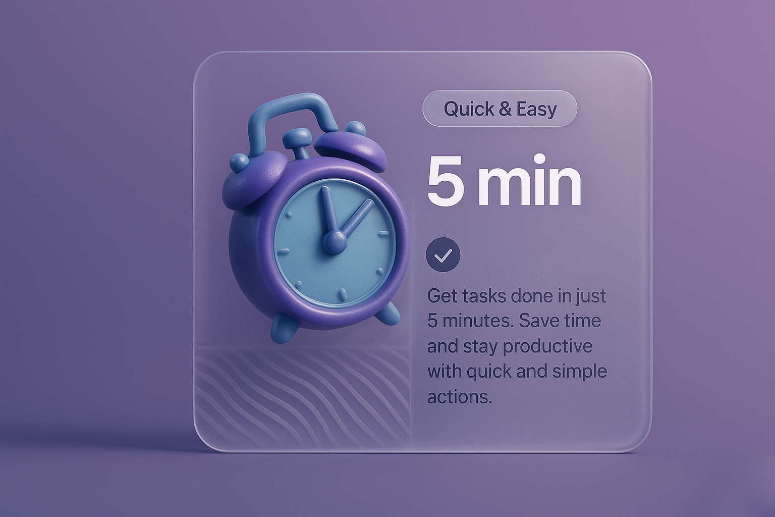 /Collection: /by davooda/Type: PNG/This image features a 3D illustration of a purple alarm clock set against a smooth gradient background. The clock displays '5 min' and includes a text block with a brief description, all framed in a modern design.