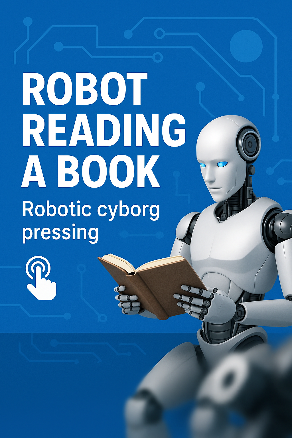 A modern digital illustration featuring a humanoid robot engrossed in reading a book against a tech-inspired blue background. Ideal for educational or tech-related content.