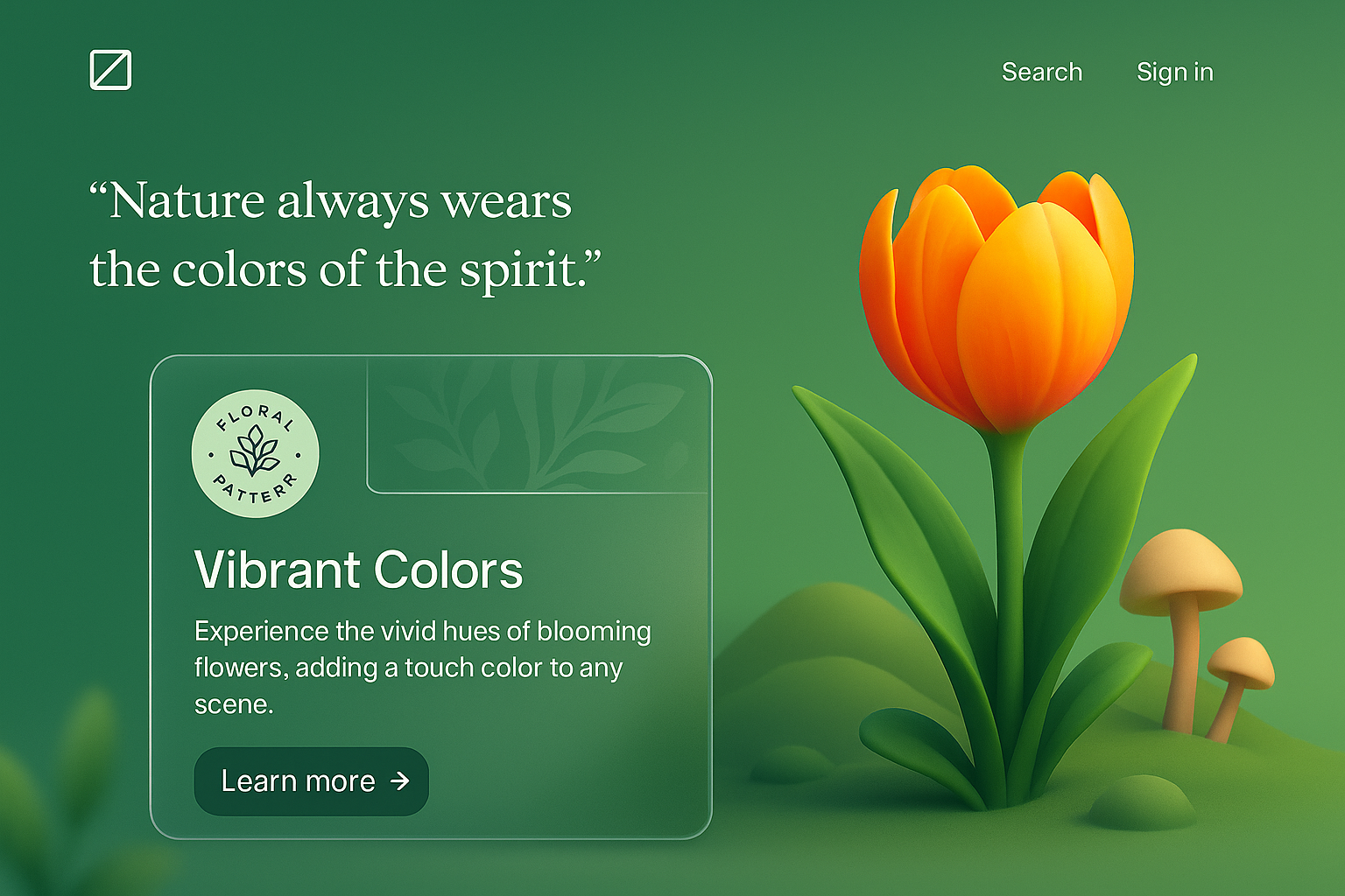 /Collection: /by davooda/Type: PNG/A vibrant web page design featuring a stylized floral pattern. The layout includes a quote, action button, and colorful elements against a smooth gradient background.