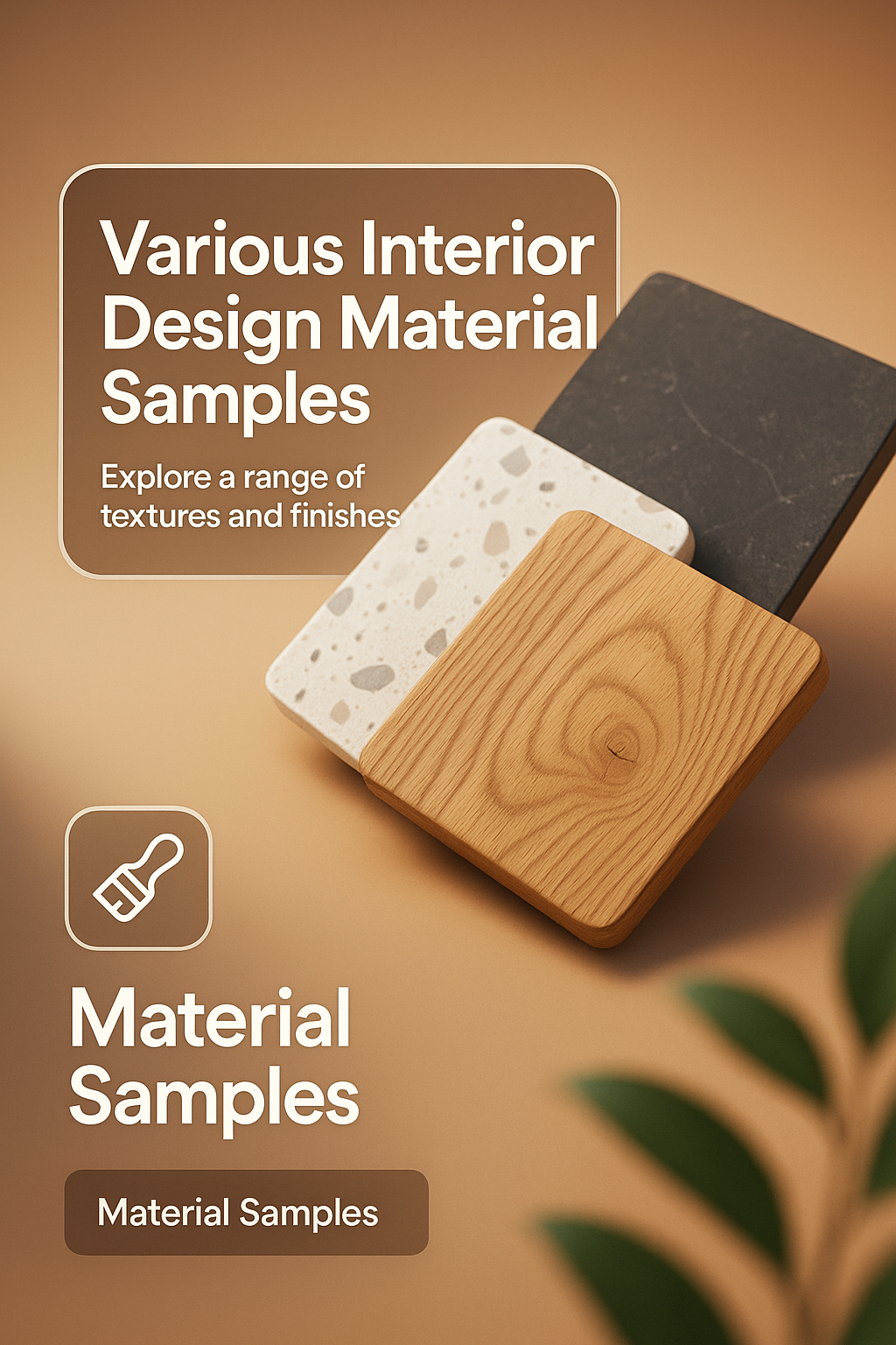 This image features a collection of interior design material samples showcasing textures and finishes, ideal for design inspiration and selection.