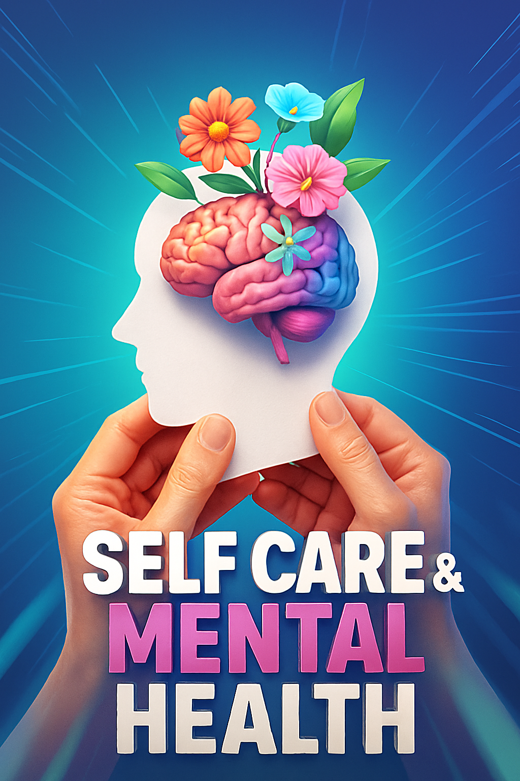 /Collection: /by davooda/Type: PNG/A hands-on illustration of a paper head with a colorful brain adorned with flowers, symbolizing self-care and mental health. The dynamic design features a vibrant gradient background.