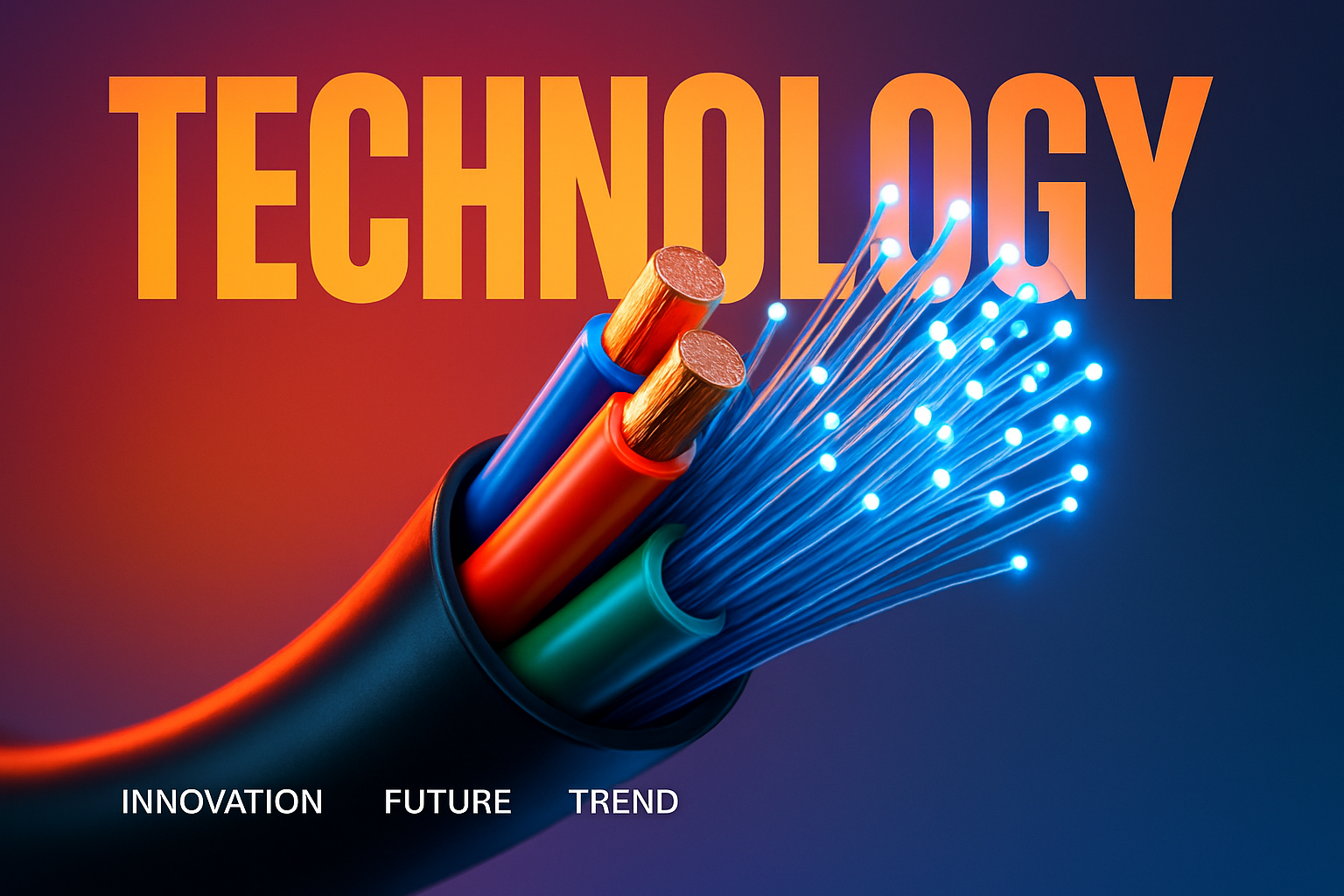 /Collection: /by davooda/Type: PNG/An artistic representation of electric cables and optical fibers showcasing intense colors. The composition features a bold 'TECHNOLOGY' headline, emphasizing modernity and innovation.