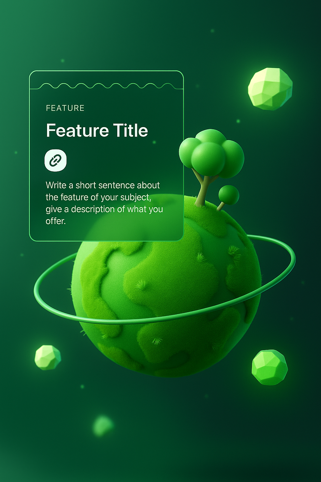 A captivating 3D illustration of a small green planet surrounded by geometric shapes in a gradient background. The design integrates a feature block seamlessly with text elements.