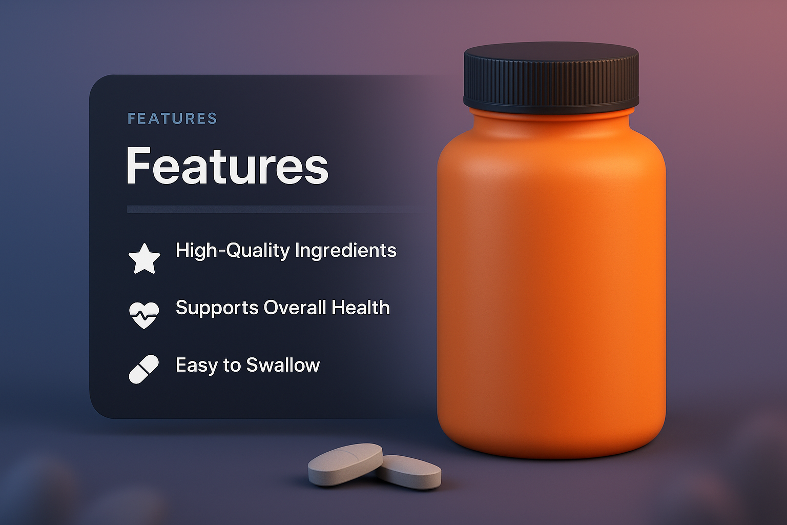 /Collection: /by davooda/Type: PNG/A vibrant 3D illustration of an orange supplement bottle, accompanied by a dark panel listing its features. The design emphasizes high-quality ingredients and user-friendly aspects.