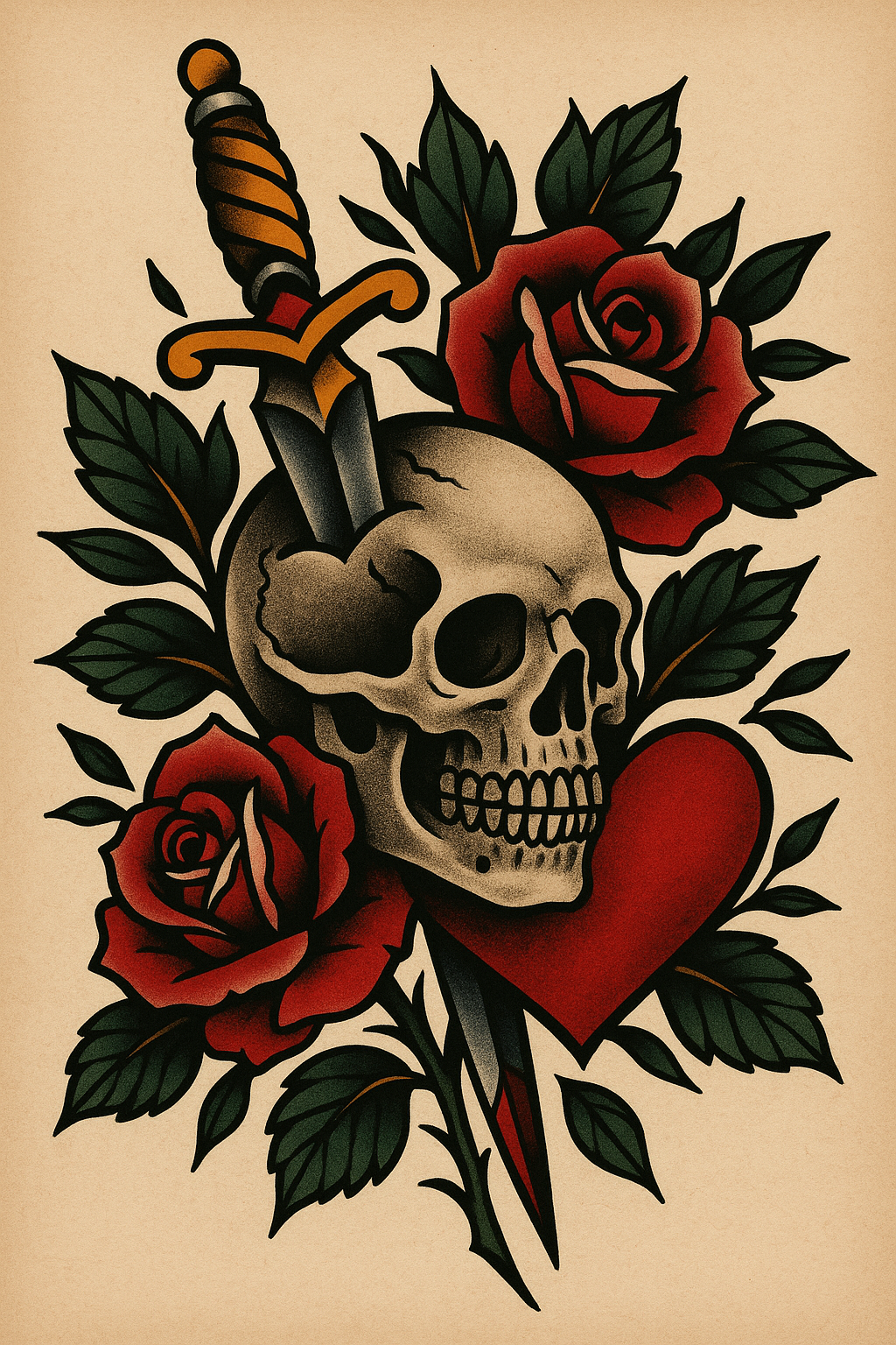 Vintage Tattoo Design Featuring Skull, Roses, and Dagger