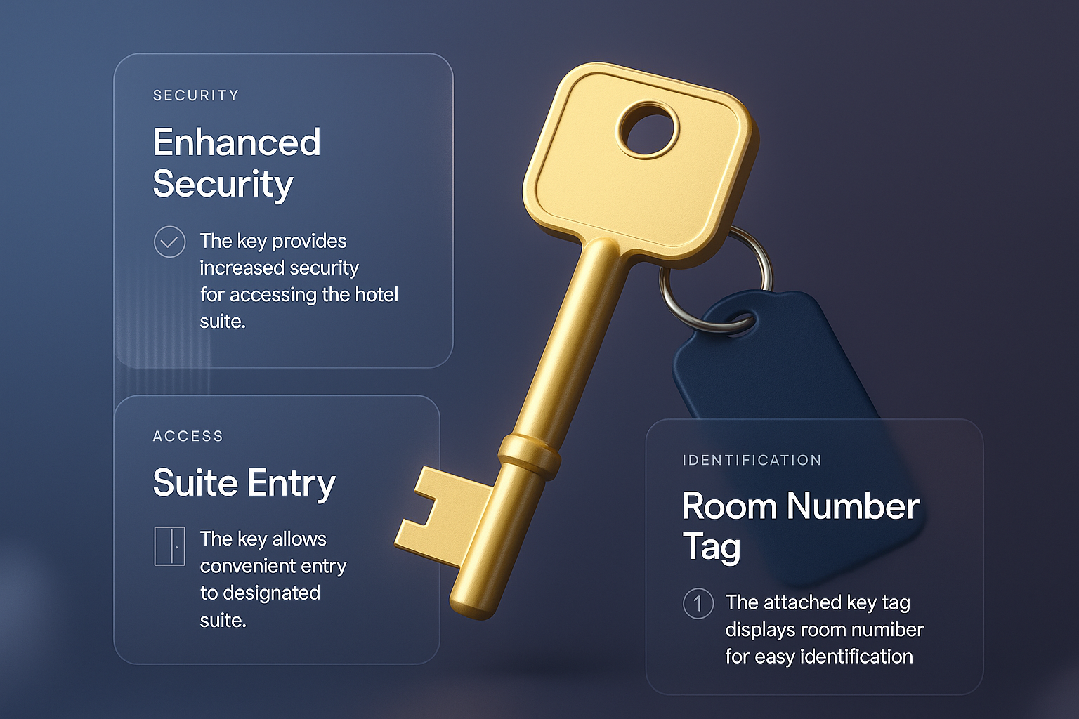 A detailed 3D illustration of a hotel suite key with accompanying feature blocks. The design emphasizes security, access, and identification elements, presented on a smooth gradient background.