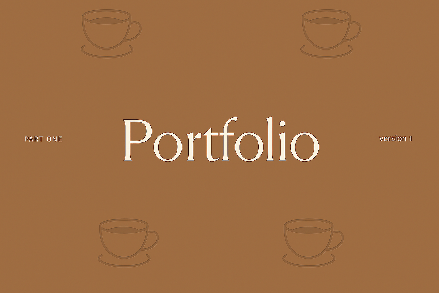 A stylish portfolio design featuring a warm brown background with coffee cup illustrations and elegant typography. The layout includes sections labeled 'Part One' and 'Version 1'.